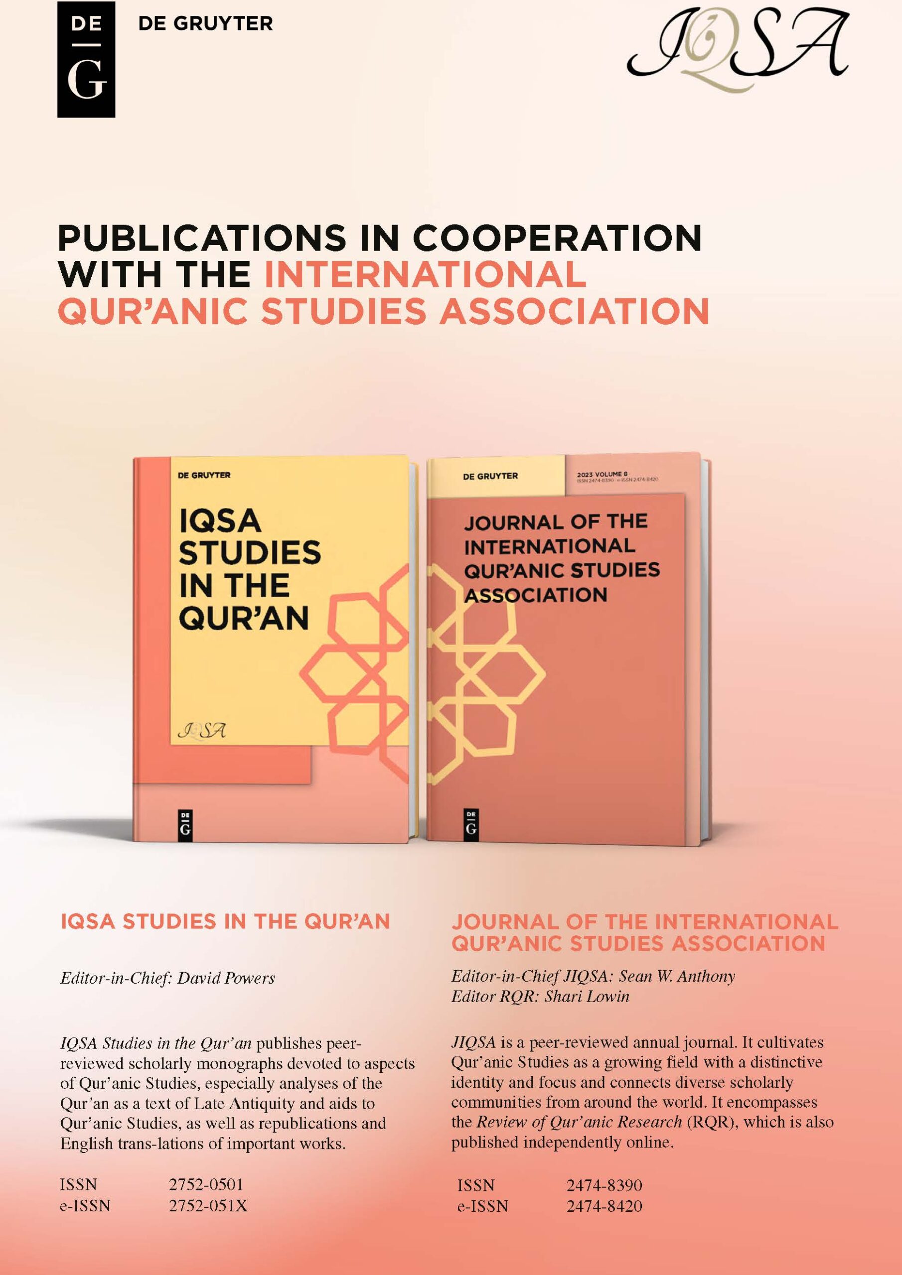 The ninth volume of the Journal of the International Qur’anic Studies Association (JIQSA) was successfully published under the expert editorial leadership of Sean W. Anthony (JIQSA), Shari Lowin (Review of Qur’anic Research), and Saqib Hussain (Associate Editor). Additionally, De Gruyter made all articles from JIQSA Volume 8 publicly accessible, with select articles from Volume 9 also available as open access. For information on subscriptions and submissions, visit our journal homepage at De Gruyter.